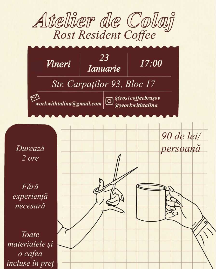 Vei explora tehnica colajului, vei decupa, combina imagini, texturi și culori și vei crea o lucrare unică, exact așa cum o simți. Atelierul este gândit ca o experiență relaxantă, fără presiune, perfectă pentru a te deconecta de la agitația zilnică.