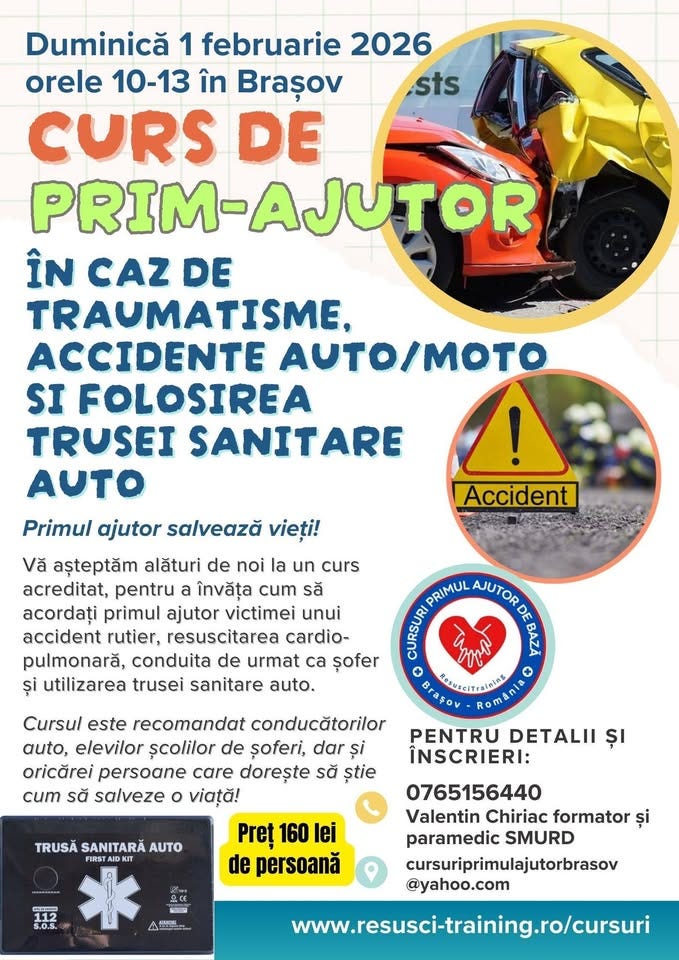 Înscrieri și detalii la telefon 0765156440 sau cursuriprimulajutorbrasov@yahoo.com