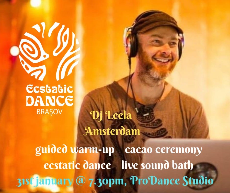 Prima ediție ecstatic dance a anului 2026 va fi pe 31 ianuarie alături de dj Leela din Amsterdam. Evenimentul este deschis tuturor, indiferent de vârstă sau experiență. Un spațiu sigur și liber, în care fiecare se poate exprima prin mișcare autentică.