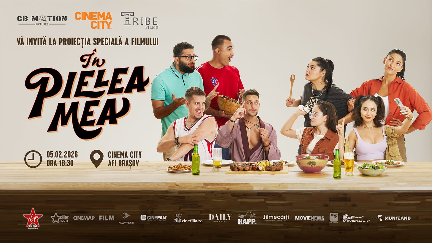Actorii George Tănase, Sergiu Costache, Azaleea Necula, Gabriel Vatavu și Alexandra Răduță, alături de regizorul Paul Decu, invită publicul din Brașov pe 5 februarie la proiecțiile speciale ale comediei „În pielea mea” de la Cinema City AFI și CinemaOne Coresi Shopping Resort.