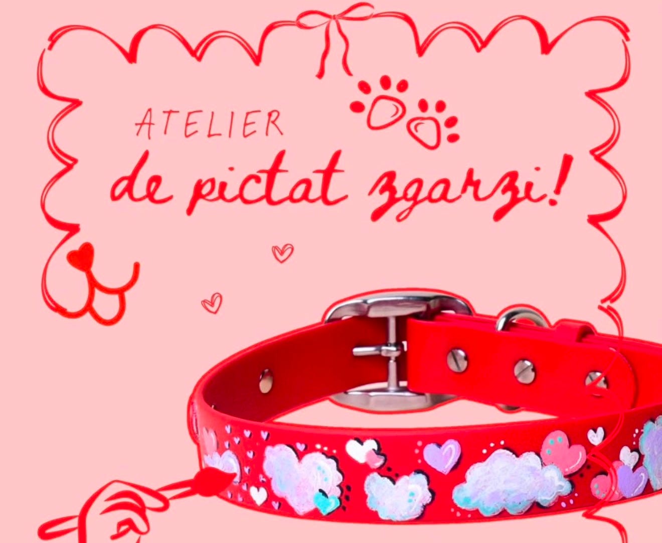 Ce zici de o dupa-amiază diferită? Un atelier în care vei picta o zgardă pentru cațelul tău - o pauză creativă, relaxată, în care pictezi ce vrei, cum vrei (bine, sper să îi și placă :) Prețul include zgarda din BioThane pe care vei picta, toate materialele necesare + snacks & drinks.