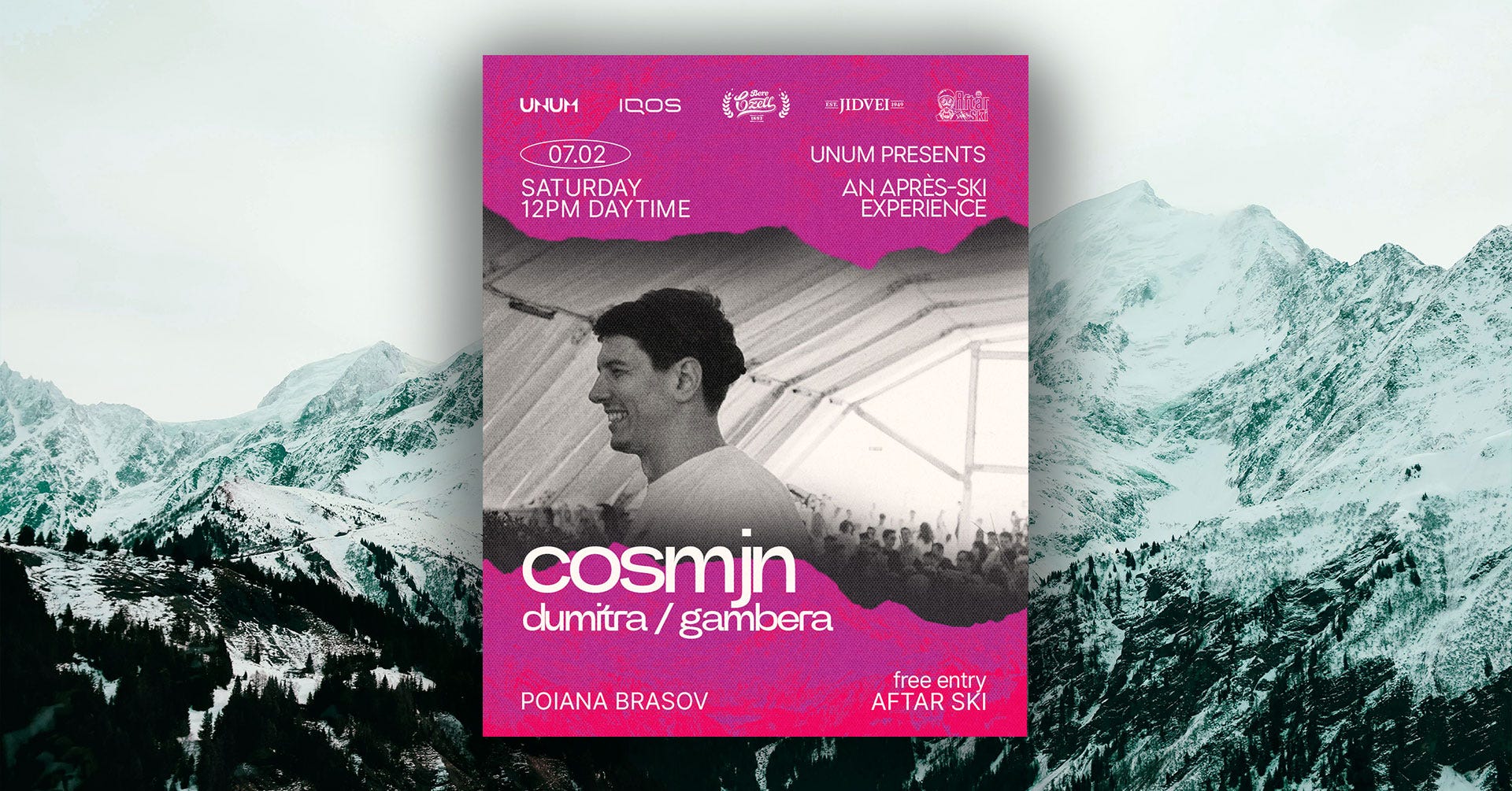 O nouă experiență Après-ski UNUM, alături de artiștii Cosmjn, Dumitra și Gambera. Cosmjn este prezent pe scena muzicii electronice de la finalul anilor 2000 și a început să fie cunoscut internațional în 2015, odată cu turnee în Europa, America, Asia și Australia. Seturile sale îmbină house și techno într-un stil curat și echilibrat, care l-a transformat într-unul dintre cei mai apreciați artiști români ai generației sale.
