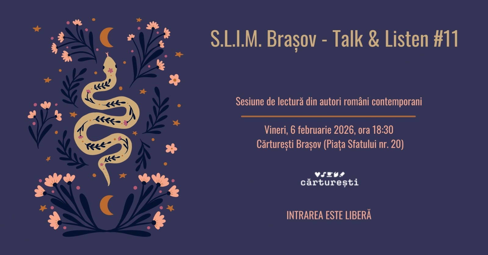 Echipa S.L.I.M continuă să exploreze literatura română contemporană, și te invită să citim, să ascultăm și să povestim într-un spațiu relaxat, fără grabă și fără presiune.